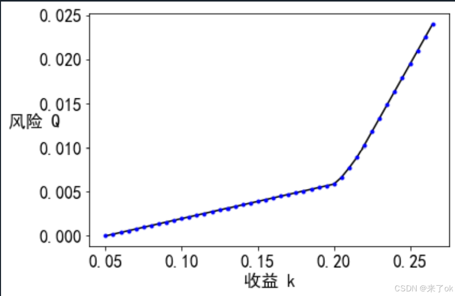plt.xlabel("收益 k"); plt.ylabel("风险 Q",rotation=0)