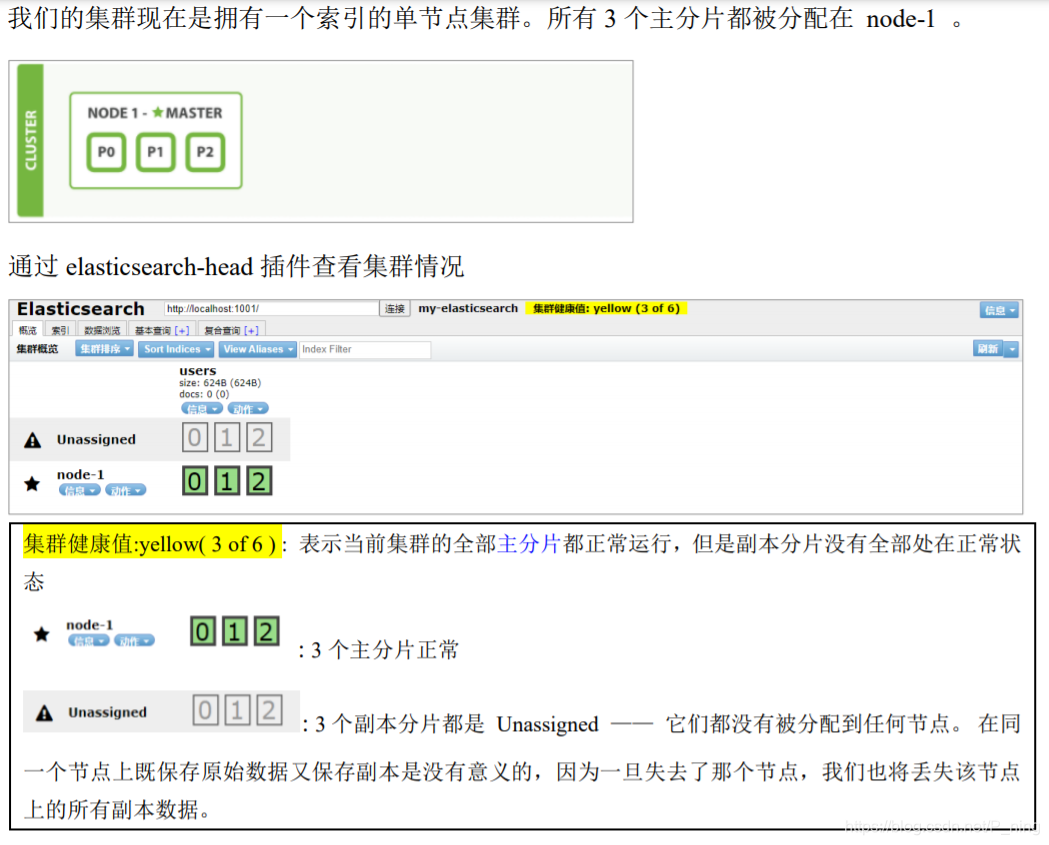 单节点集群 1. 单节点集群 2. 故障转移 3. 水平扩容 如果我们想要扩容超过 6 个节点怎么办呢? 4. 应对故障 为什么我们集群状态是 yellow 而不是 green 呢? 1. 单节点集群 我们在包含一个空节点的集群内创建名为 users 的索引,为了演示目的,我们将分配 3 个主分片和一份副本(每个主分片拥有一个副本分片) { "settings" : { "number_of_shards" : 3, "number_of_replicas" : 1 } } 当前我们的集群是正常运行的,但是在硬件故障