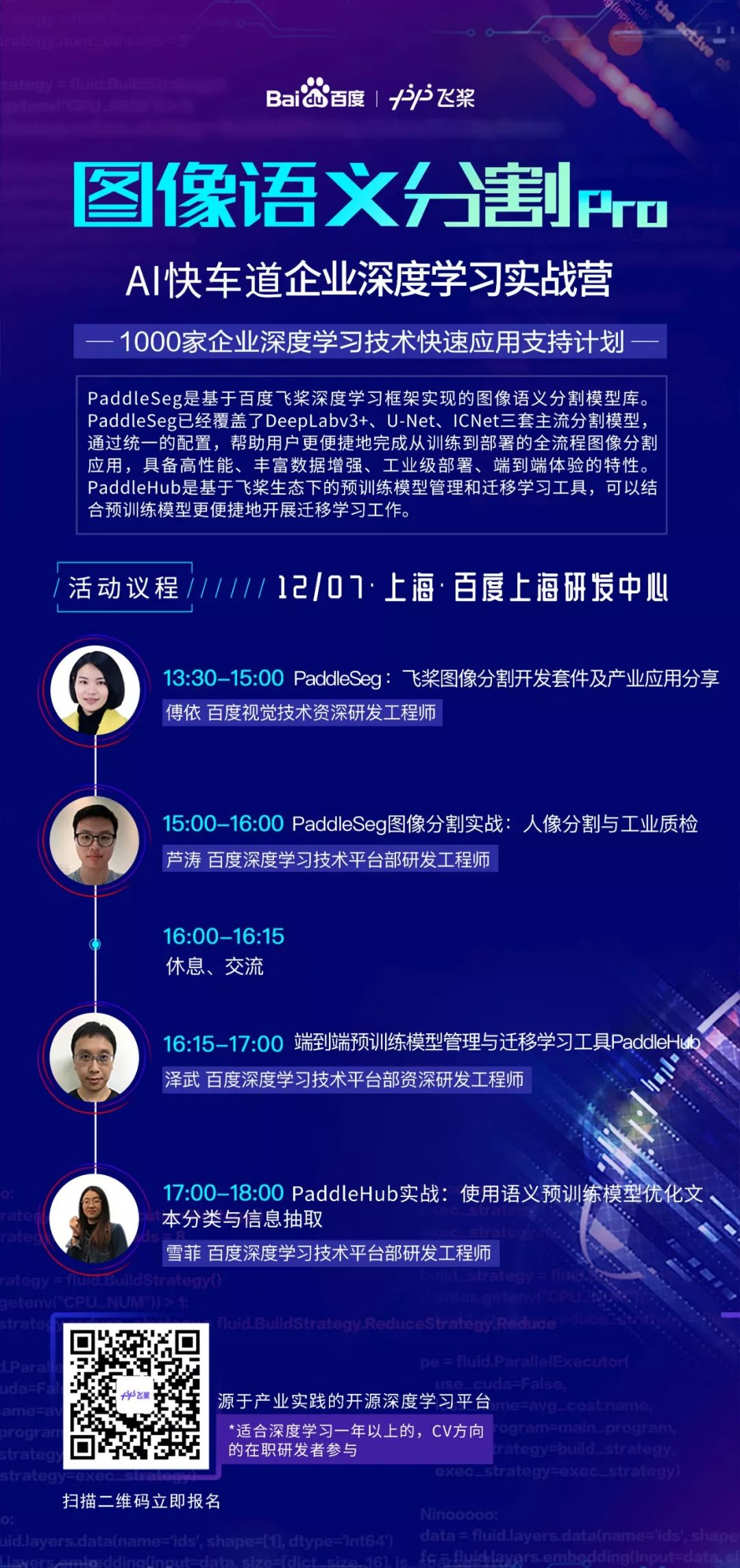 百度AI快车道将于12月7日在上海举办图像语义分割Pro课程,聚焦PaddleSeg与PaddleHub,详解图像分割技术在工业质检、人像处理等场景的应用,以及如何利用预训练模型优化文本分类与信息抽取。