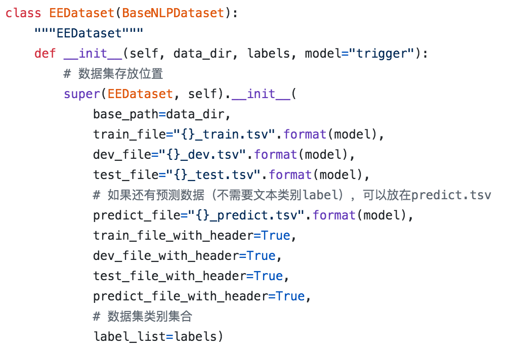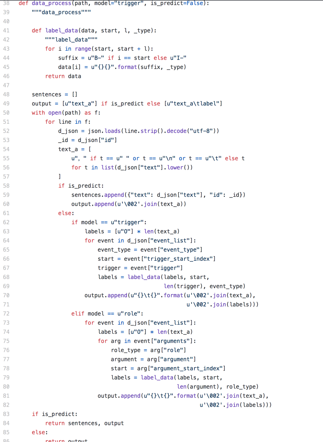输入的是带标注结果的事件数据或者是仅预测数据,并且还需要根据不同的模型生成数据,触发词抽取模型需要利用标注的触发词和事件类型生成训练样本,论元抽取模型需要利用论元和论元角色生成训练样本。最终统一成如下处理方式。
