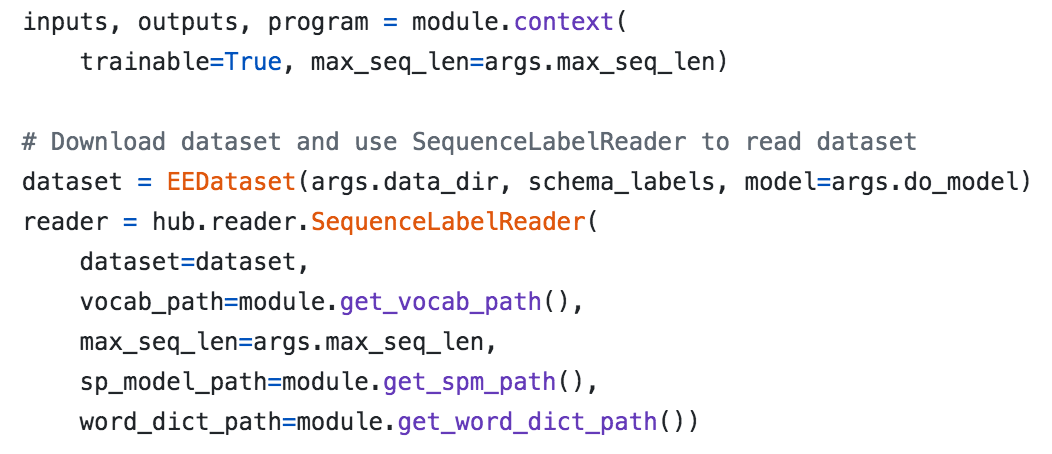 PaddleHub已经对基础的方法做了高度封装,极大减少了代码量。Baseline是两个序列标注模型,那么模型代码部分可以共用,输入数据处理部分需要做适配即可。具体代码查看: