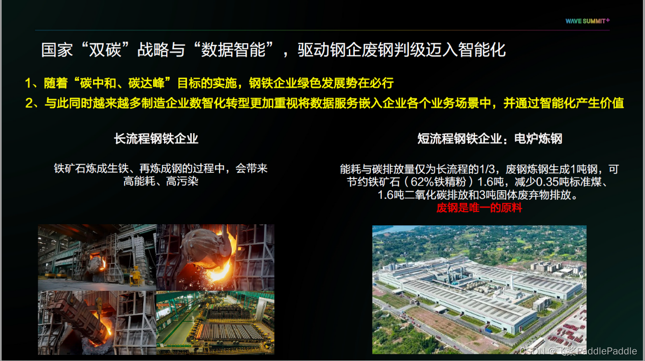 目前,国家“双碳”战略与“数据智能”环境正驱动着钢铁企业废钢判级迈入智能化道路。我国钢铁企业主要以长流程钢企为主,长流程钢企主要通过铁矿石炼成生铁,再炼成钢的链路实现生产,在此过程中会带来高能耗和高污染的问题。