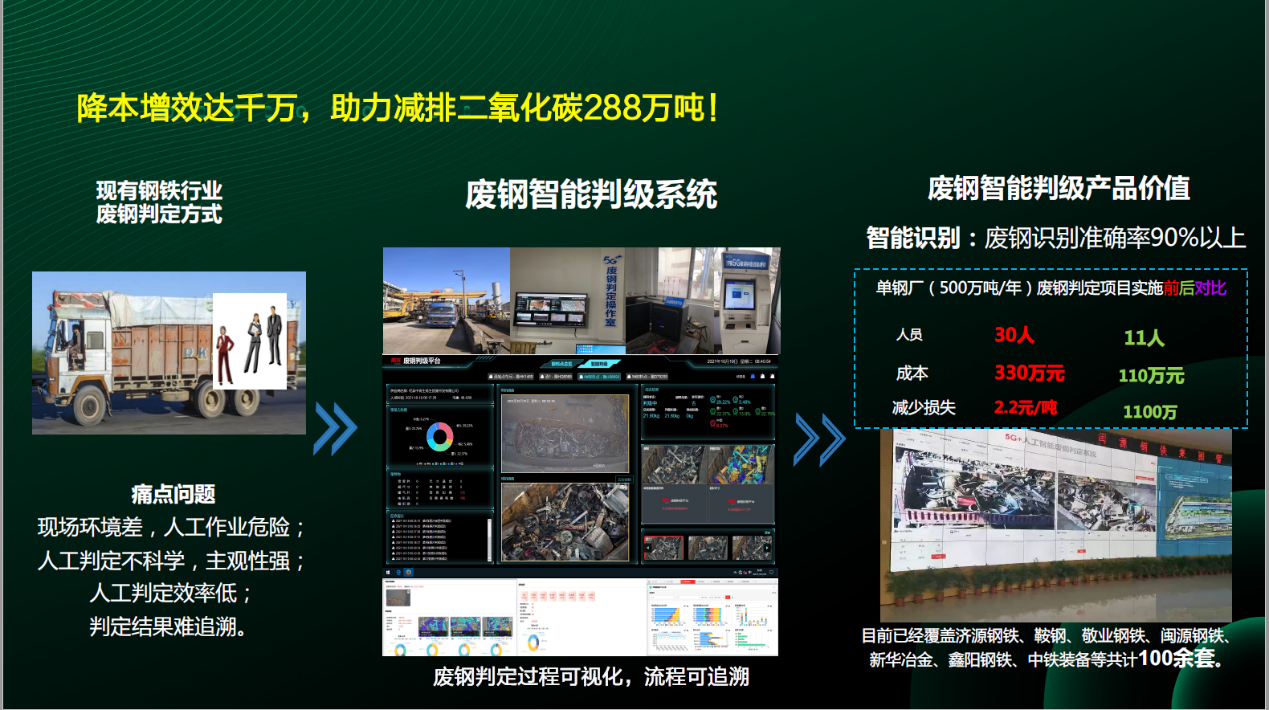 用友通过智能化方式帮助钢铁企业实现经济和社会价值。首先,用友助力企业实现降本增效,降本增效规模达到千万级。其次,用友助力企业节能减排,减少钢企二氧化碳排放量达到288万吨。以下数据是基于其中一家钢铁企业安装废钢智能判级系统后产生的价值,人员成本从30人下降到11人,采钢成本从330万元下降到110万元,减少经济损失达到了1100万。