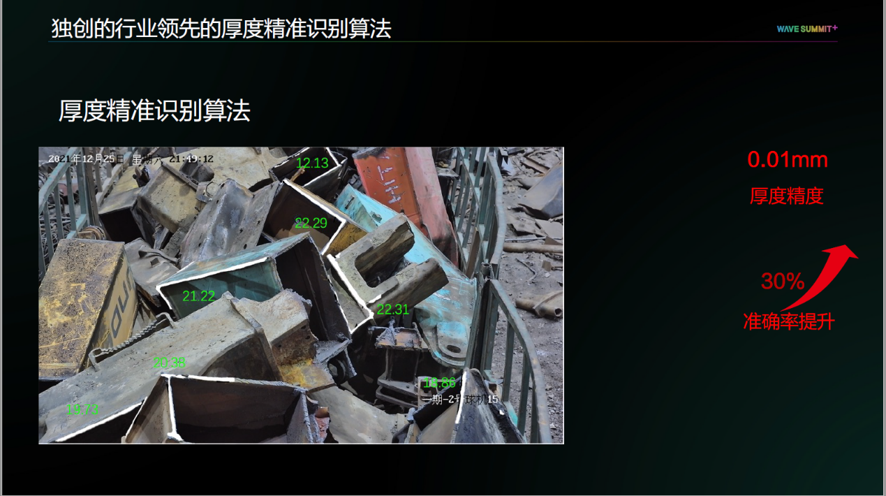 此外,用友独创的行业领先的厚度识别算法可以有效将厚度识别精度达到0.01毫米。如下图所示,对废钢边缘的厚度进行有效识别,准确率较同行提升30%。