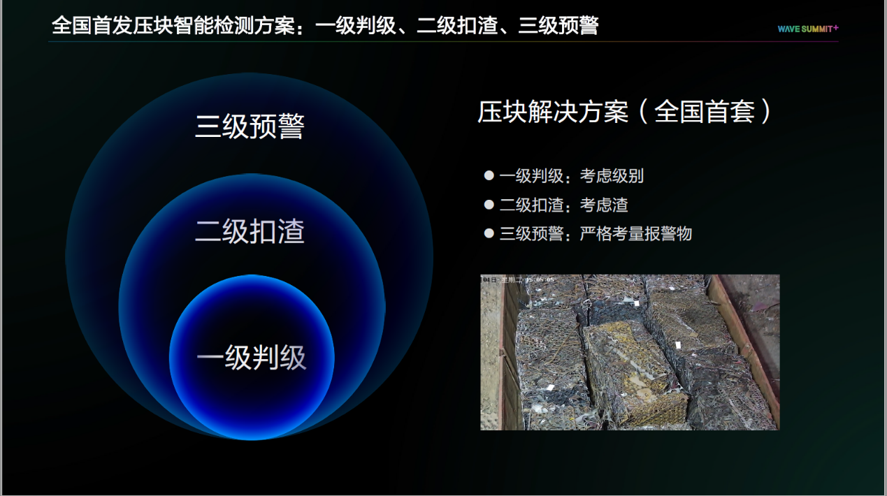 针对压块质检,用友在全国首发了一级判级、二级扣渣、三级预警的压块智能检测方案。对于供应商来说,压块运输价格便宜、效率较高,是一种非常好的废钢运输方式。但是无论人工或者视觉方式都无法检测出压块内部的情况,而用友的三级预警方式能够有效帮助钢企接纳压块采购。