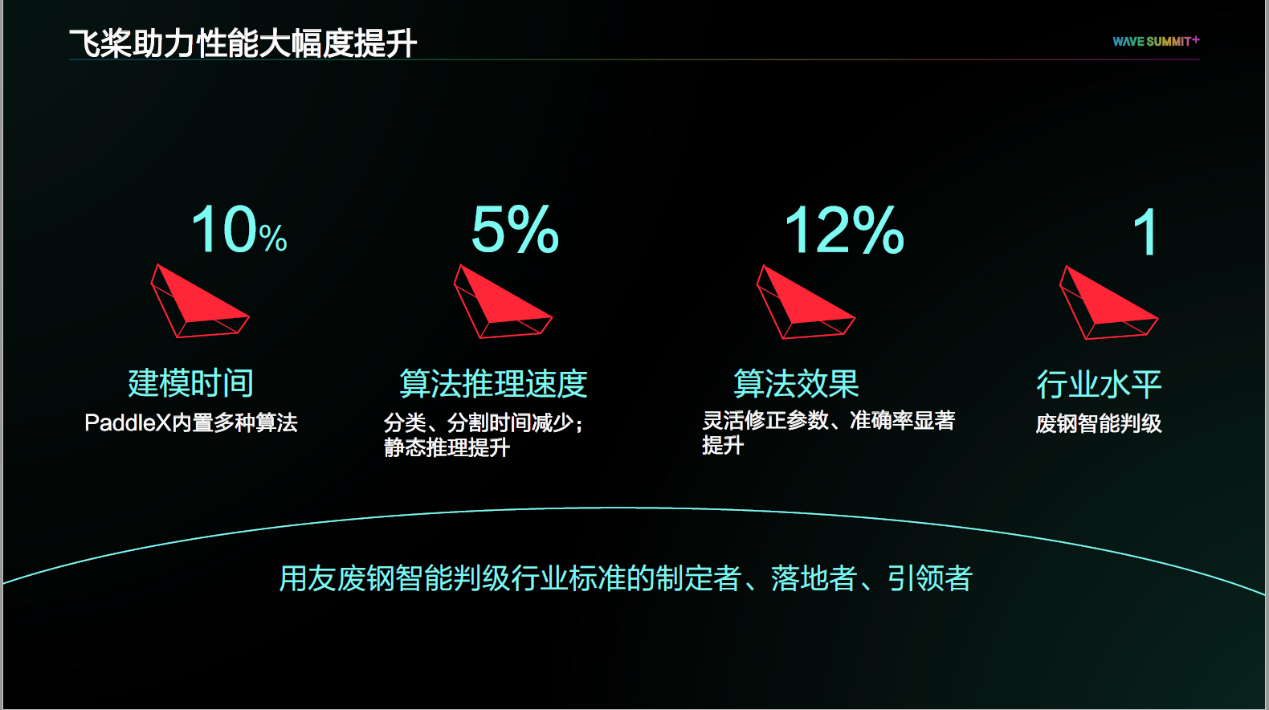 在飞桨的助力下,用友系统性能实现大幅提升。建模时间提高10%,算法推理速度提高5%,算法效果提升12%,准确率显著提升。性能的提升助力用友系统在废钢判级领域行业水平达到第一名,成为了行业标准的制定者、落地者、引领者。