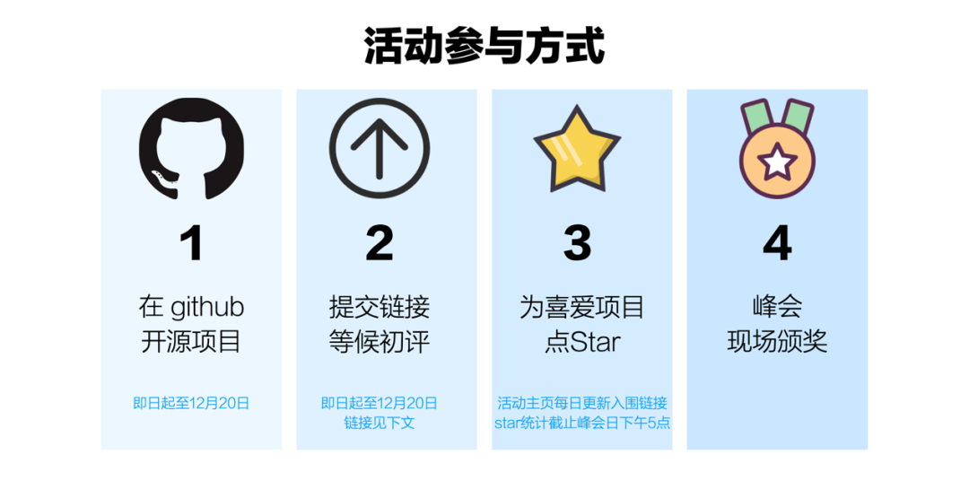 开发者在开源项目后可将项目的Github链接提交于底部报名链接中(链接提交后即可视为成功报名,若后续需补充材料可重复提交问卷),提交时间为即日起至12月20日。我们将于12月8日起发布活动主页,每日更新入围的项目链接,欢迎伯乐们为入围的链接送上star。