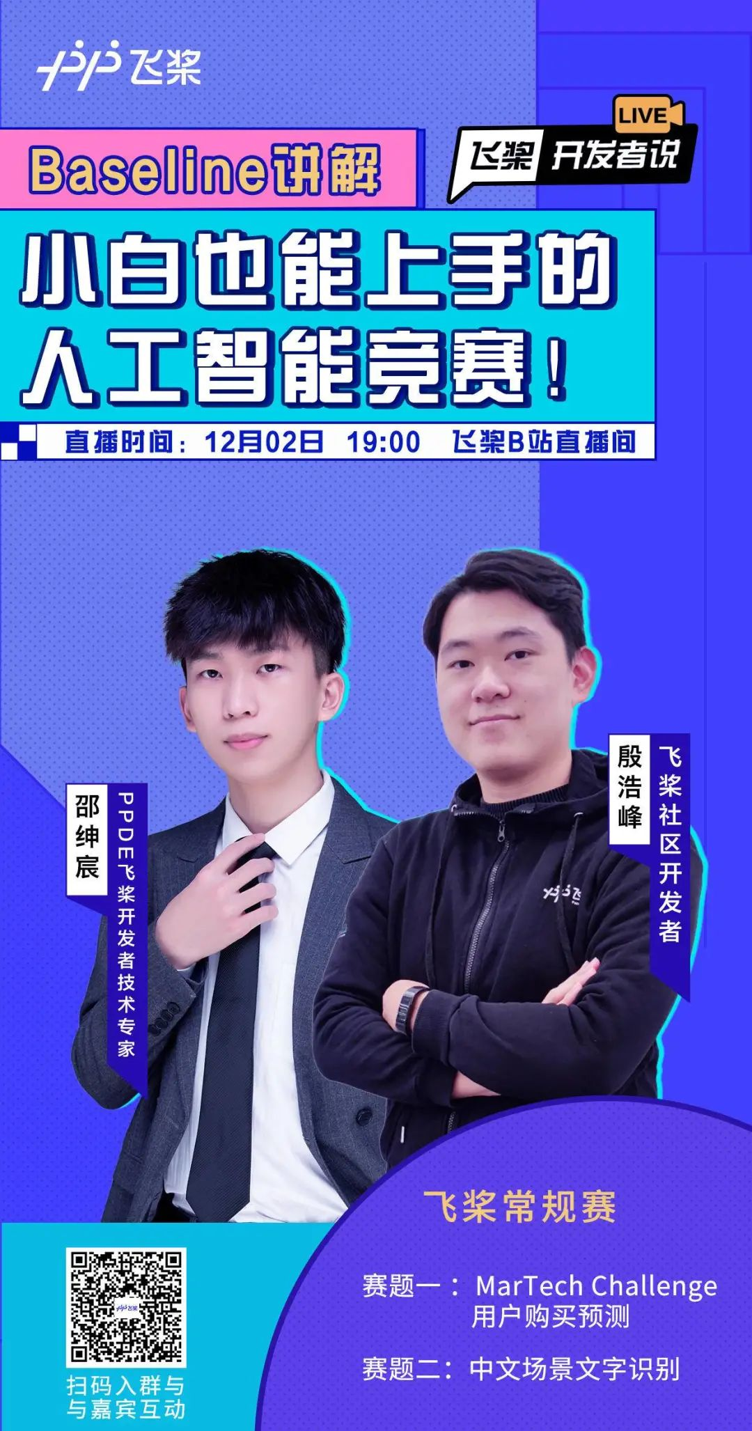 飞桨常规赛为开发者提供入门 AI 比赛的机会,有用户购买预测和中文场景文字识别两个赛题。PPDE 邵绅宸、殷浩峰将带来 Baseline 讲解,分别教大家用 PaddleRec 构建组网预测及用飞桨框架搭建文字识别模型。比赛有福利,飞桨开发者说直播也定期开展。