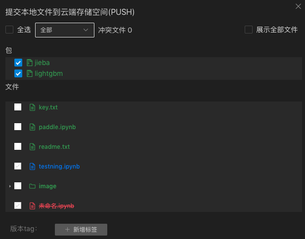 此外,BML CodeLab支持对代码、数据、模型等类型文件的版本控制;可通过不同文件颜色区分新建文件、已删除文件、已修改文件,方便用户监控文件变化,把控版本生成。
