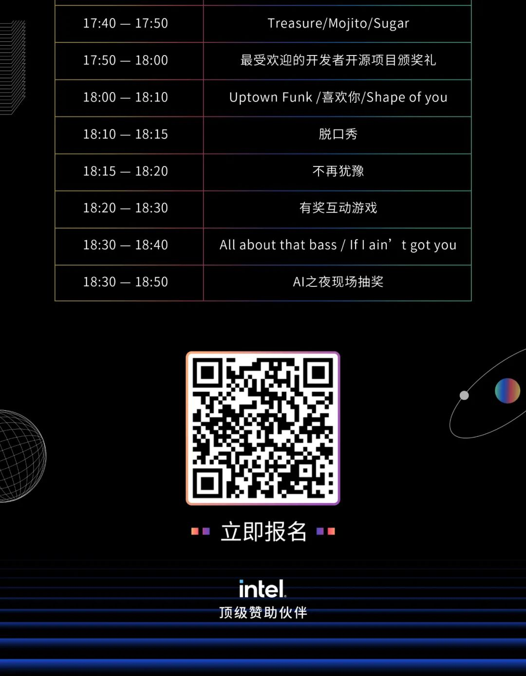 AI之夜名额有限,面向定邀核心开发者及部分幸运观众开放,每天将在社群中抽取幸运观众,欢迎加入社群(提交报名后可见社群二维码),感兴趣的开发者们别错过哦~