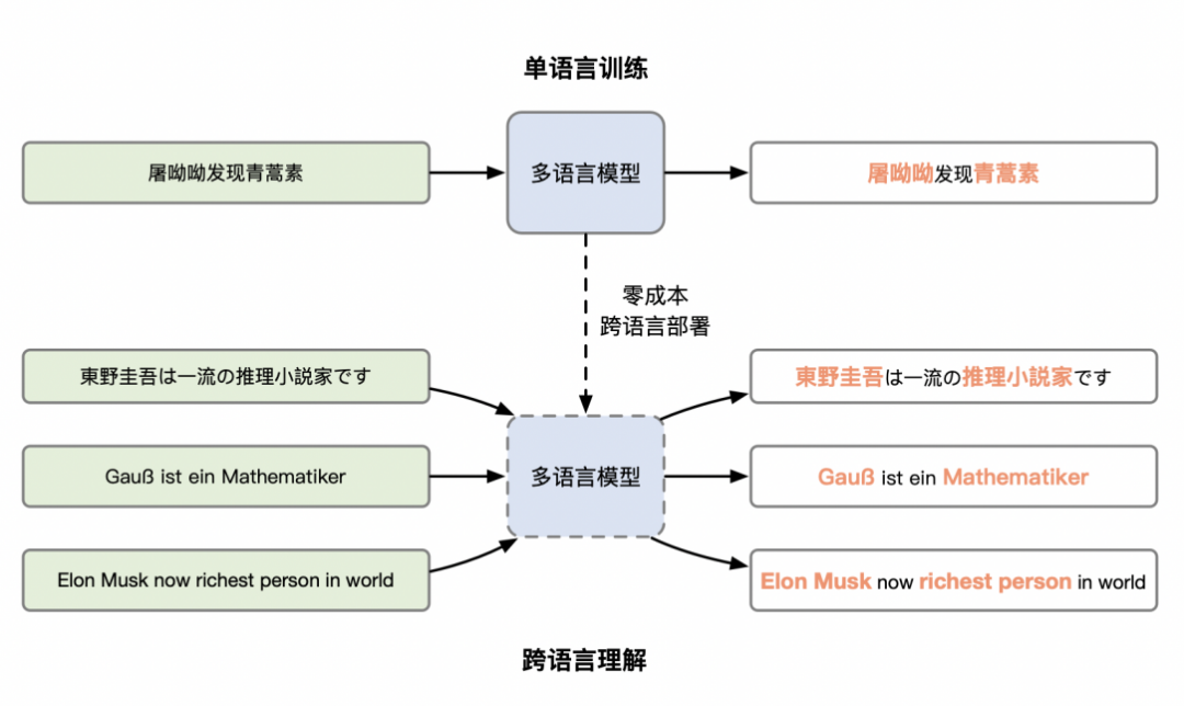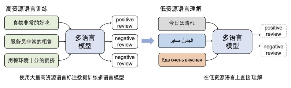 1)Cross-lingual Transfer:该方式将英文训练的模型直接在其他语言上测试,验证模型的跨语言理解能力。例如,让模型理解 “这家餐厅环境不错” 是正向情感,模型需要判断 “I am very happy.” 也是正向的情感。在实际应用中,如果缺乏某种语言的标注数据,该技术可以通过其他语言的标注数据对多语言模型训练解决该问题,降低小语种系统的构建难度。