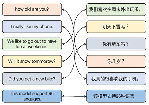 跨语言检索任务是在双语语料库中检索语义相同的句子,如下图所示,ERNIE-M 可使得用户只用某一种语言,例如汉语,便可检索到其他语言的结果,如英语、法语、德语等结果。该技术使信息跨越不同语言之间的鸿沟,帮助全球的网民搜索到更多有价值的信息。ERNIE-M 在跨语言检索数据集 Tatoeba 上取得了准确率 87.9% 的效果。