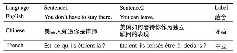 自然语言推断是自然语言理解中的一项重要的基准任务,该任务的目标是判断两句话之间的逻辑关系。多语言数据集 XNLI 数据集包含 15 种语言,既有英语、法语等常见语言也有斯瓦希里语等小语种语言。