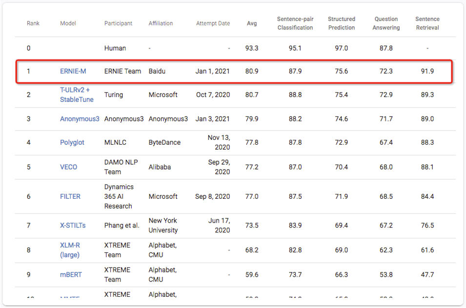 2021 年 1 月 1 日,ERNIE-M 在以 80.9 分的成绩登顶榜首,刷新了该榜单记录。
