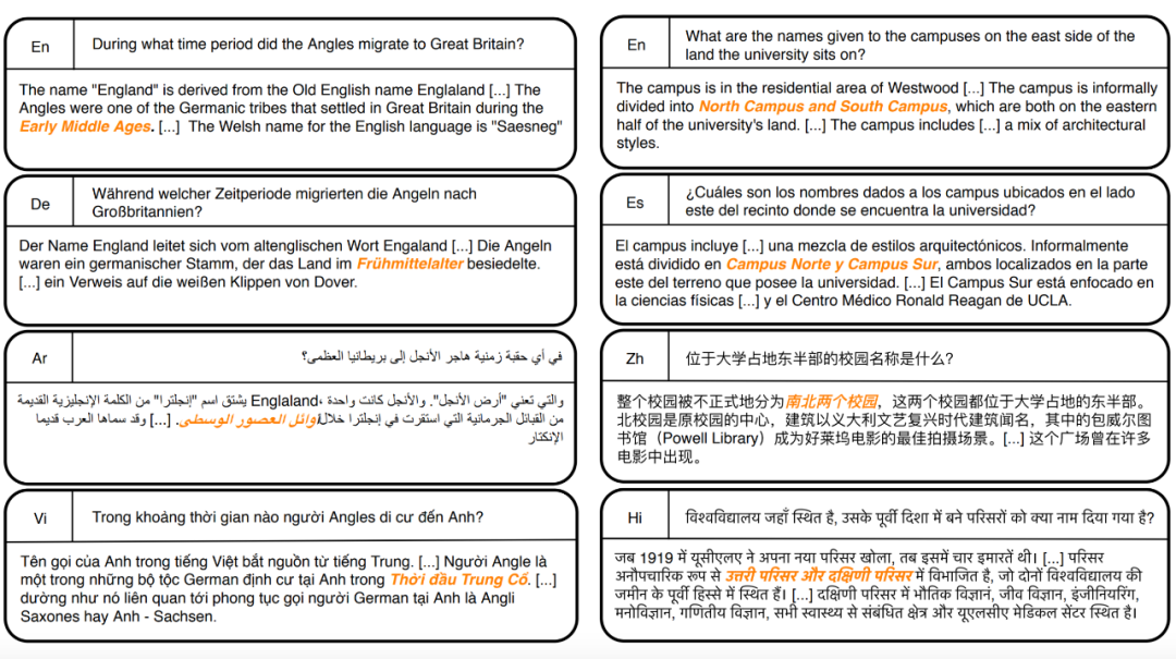 命名实体识别任务的目标是识别出文章中的人名、地名、时间、机构等信息。其可以帮助人们快速地从大量文章中提取出有价值的信息。如下图所示,使用多语言模型可以帮助我们在小语种文章上做信息抽取。ERNIE-M 在 CoNLL 数据集上进行评测,同时在 Cross-lingual Transfer 和 Multi-language Fine-tuning 两种模式下验证了效果。研究者用英语对 ERNIE-M 进行微调训练,在荷兰语、西班牙语和德语上进行了测试,平均 F1 能达到 81.6%,如果使用所有语言的训练语料,平均 F1 可进一步提升至 90.8%。