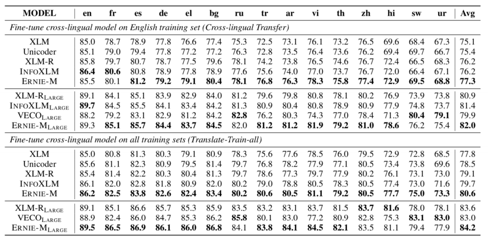 ERNIE-M 在 Cross-lingual Transfer 和 Multi-language Fine-tuning 两种模式下验证了效果,研究者用英语对 ERNIE-M 进行微调训练,在汉语、德语、乌尔都语等语言上测试,能达到平均准确率 82.0% 的效果。如果使用所有语言的训练语料,准确率可以进一步提升到 84.2%。