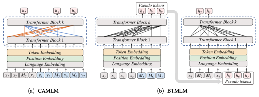 在第一阶段的学习中,ERNIE-M 提出了 Cross-attention Masked Language Modeling (CAMLM) 预训练算法。该算法在少量双语语料上捕捉语言间的对齐信息。在 CAMLM 中,将一对双语句子记为 <源句子,目标句子>。CAMLM 需要在不利用源句子上下文的情况下,通过目标句子还原被掩盖的词语。例如:输入的句子对是 <明天会 [MASK][MASK] 吗,Will it be sunny tomorrow>,模型需要只使用英文句子 <Will it be sunny tomorrow> 来推断中文句子中掩盖住的词 <天晴>,使模型初步建模了语言间的对齐关系。