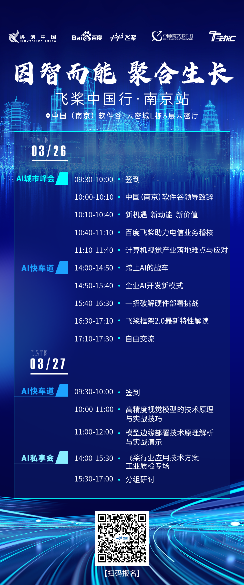 飞桨中国行第二站将落地南京,活动为期两天3月26-27日,分为三部分:以AI政策、行业趋势、AI产业落地相关技术及应用案例剖析为主的“AI城市峰会”和“AI快车道”(日程详见下图)和以AI落地实际问题技术方案为主的“AI私享会”。