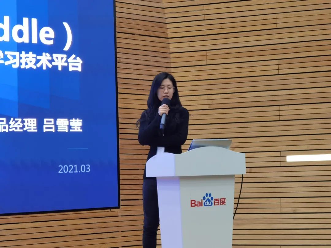 百度深度学习技术平台部高级产品经理吕雪莹做了飞桨整体介绍。她从企业生态视角出发,现场解读了百度飞桨能力及如何赋能产业。她介绍道,“AI+X”已经陆续变成了社会很多从业者学习发展的趋势,大量其他领域人才在学习人工智能。百度依托人工智能生态的力量提供了多方面资源支持,包括基于飞桨深度学习平台的一系列产品工具, AI架构师培养计划、AI快车道、AI私享会等线上线下课程……