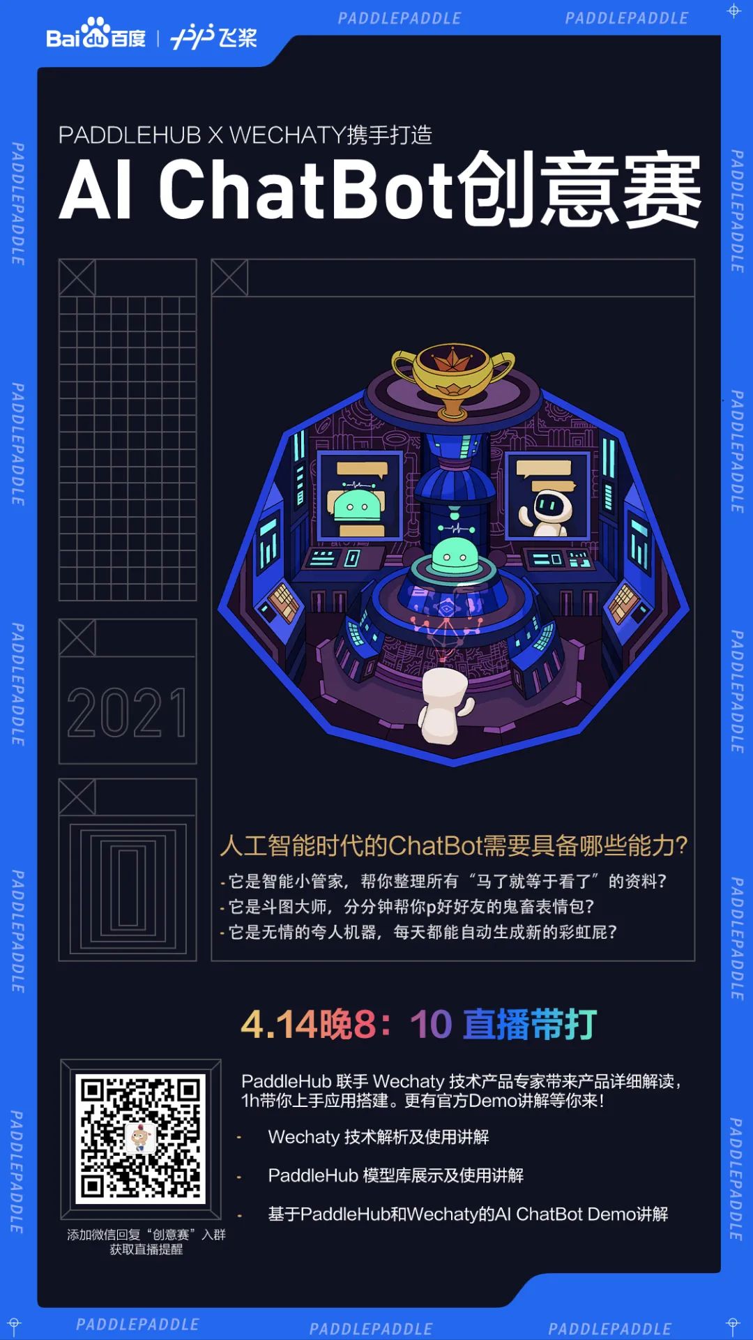 在这个时代,ChatBot的竞争早已不再局限于技术,创意也显得尤为重要。为了发掘更多优秀的ChatBot开发项目,培养更多优质人才,PaddleHub携手开源聊天机器人SDK Wechaty带来了《AI ChatBot创意赛》。