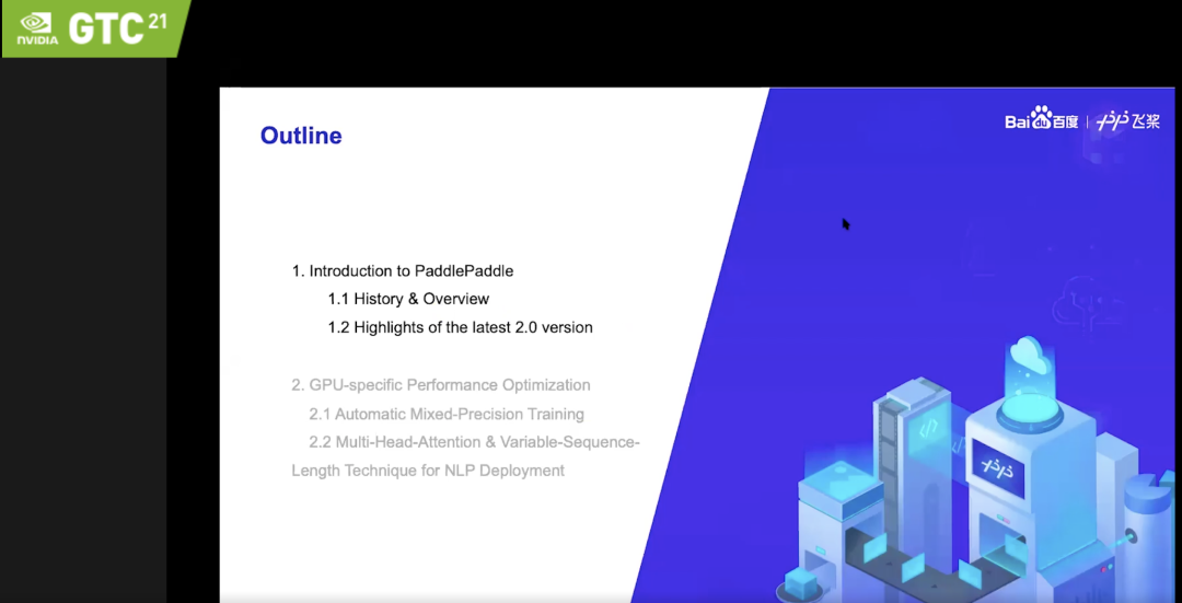 应NVIDIA邀请,百度飞桨生态产品负责人王运凯在GTC上带来了《前沿的深度学习框架设计理念及GPU性能优化技巧》的演讲,为大家介绍了飞桨框架2.0各项重大更新,包含全新的动静整合编程方式、全新设计的高层 API、改良后的大规模稀疏参数服务器等内容。同时分享针对 GPU 性能的两种优化策略,包含如何透过独家的混合精度运算策略,充分发挥 Tensor Core+FP16 的性能加速效果,达到相比 FP32 接近 4 倍的运算速度;以及在 NLP 相关模型应用场景中借助深度整合 TensorRT 中的 Multi- Head Attention Plugin 及动态变长等手法,达成在 ERNIE 等模型上超过 3 倍的性能优化。