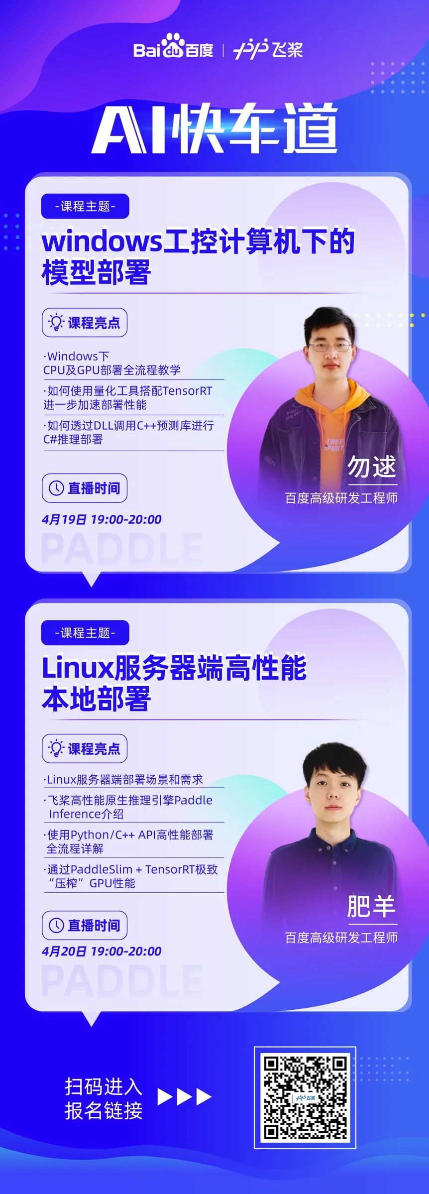 最后,如果对GTC上的技术分享意犹未尽 想进一步了解怎么在Paddle框架上提升GPU的部署性能, 欢迎扫下方二维码报名下周一(4/19)、二(4/20) 晚上19:00-20:00 飞桨b站直播,我们会由资深工程师分享更多技巧。