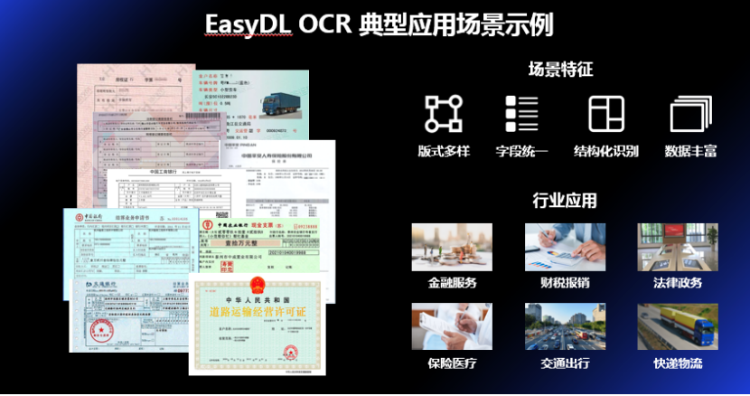 EasyDL OCR 广泛适用于各种固定版式、非固定版式的单据/票据/证照,例如:政府、企业审批流程中涉及到的各种证照文件(如食品/药品经营许可证、特种设备审批证),不同金融或税务机构发型的各类财务发票、银行单据,不同地区、不同医疗系统开具的医疗票据,各运输公司、货运平台出具的发货单/过磅单等等。