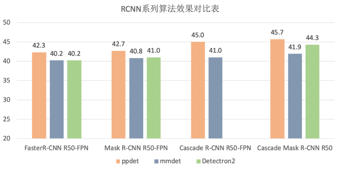 表1:RCNN系列模型在PaddleDetection、mmDetection和Detectron2开发套件下