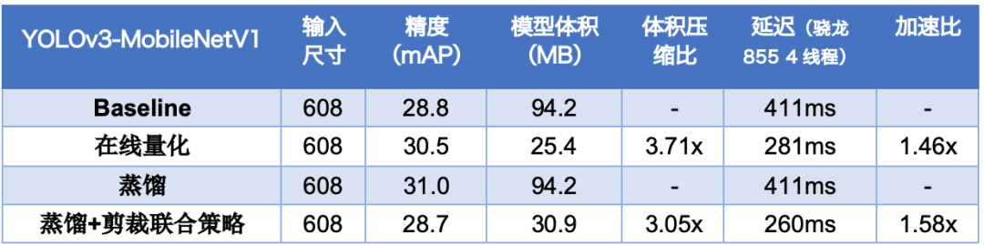 表3:基于YOLOv3-MobileNetv1模型进行模型压缩的效果对比