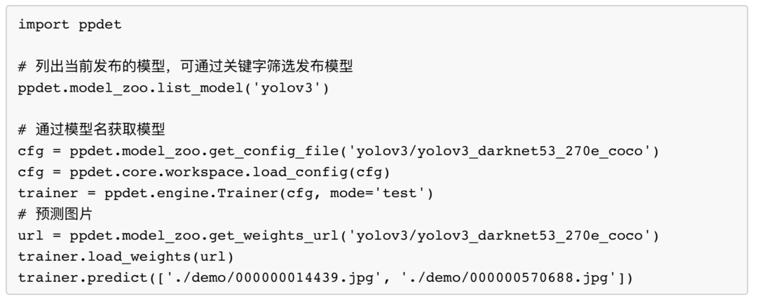 除了传统的git clone方式,PaddleDetection 2.0这次还新增了whl包的发布,用户可以直接通过pip install的方式安装,由此可以通过import ppdet的方式调用PaddleDetection 2.0下的API快速完成自己的检测任务。