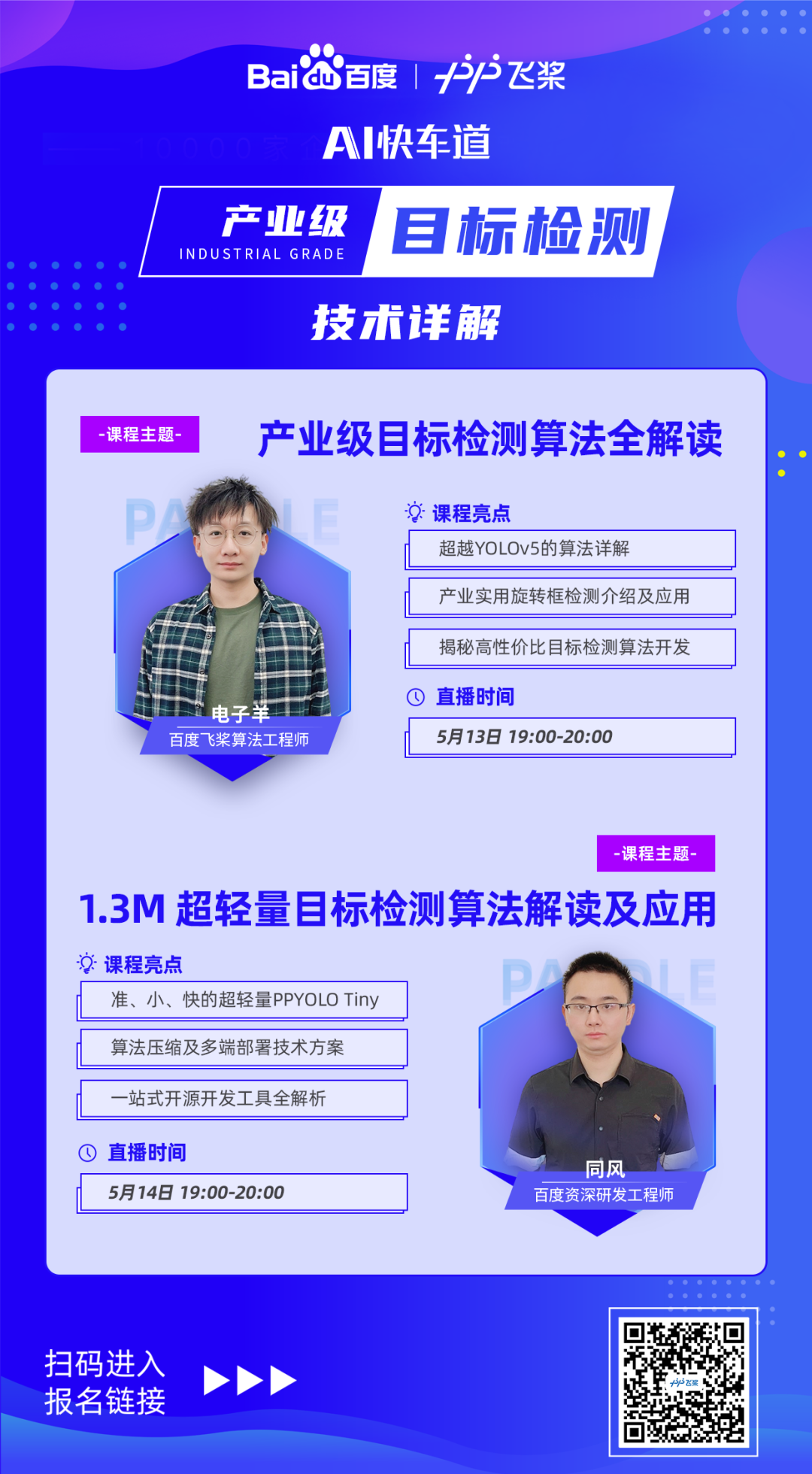 百度飞桨为了帮助大家能快速、深入、全面的了解目标检测技术,将于5月13、14日特地开设“目标检测2日直播课”。由资深研发工程师倾囊相授多年“炼丹”经验,配套真实工业落地场景案例,最先进的调优方式、训练技巧、优化技巧和工业部署方案,带您一网打尽,千万不要错过!