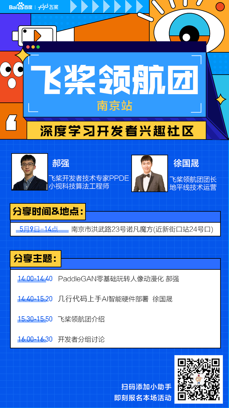 5月9日飞桨领航团南京场技术沙龙,两位主讲人将详解人像动漫化背后的算法、飞桨适配及行业AI应用案例,欢迎感兴趣的小伙伴报名哦~