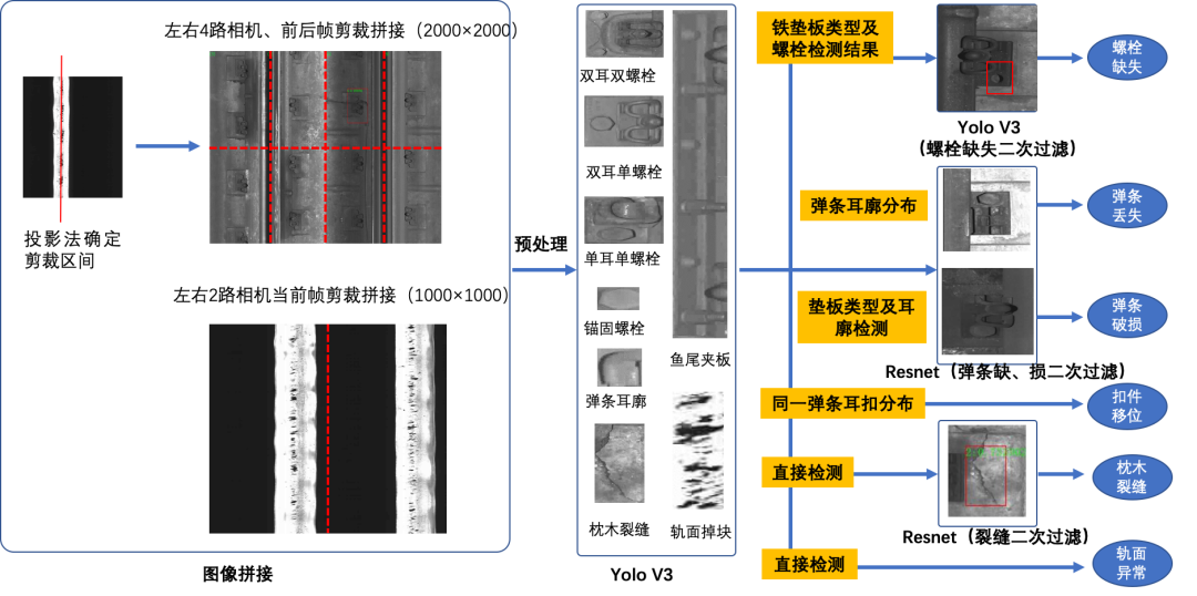 常见的轨道表面伤害检测一般是,先利用工务巡检车上的成像装置对轨道进行高清成像,再采用人工的方式进行检查,但这种方式存在效率低、滞后性强等问题。而基于飞桨的“轨道在线智能巡检系统”安装在综合检测车底,在检测车行驶过程中,对轨道表面及其紧固件进行扫描成像,同时利用边缘嵌入式 GPU 设备,实时检测轨道表面及其紧固件缺陷。检测结果通过车内展示系统呈现,并由分析人员最终确认缺陷结果,形成缺陷报表。