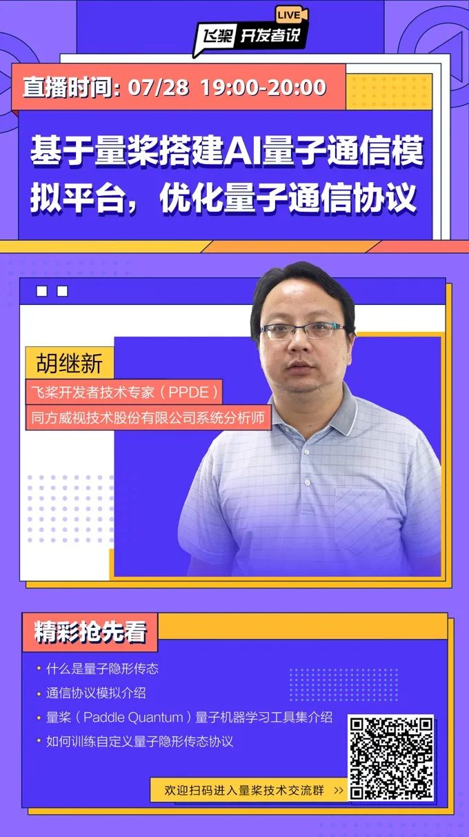 想要了解AI量子隐形传态的原理、量桨机器学习工具集的代码实现、自定义量子隐形传态协议的训练过程,欢迎大家关注7月28日19:00的飞桨开发者说直播!带上你的问题,我们邀请技术专家现场为你答疑解惑!