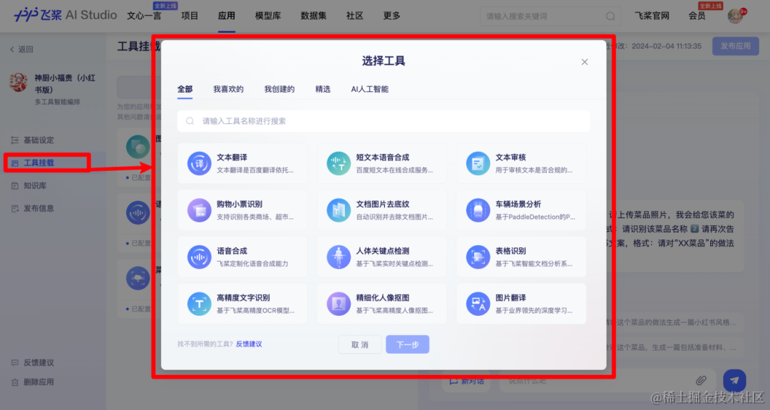 如果想要更别致、更全能的应用要怎么办呢?飞桨星河社区还支持多工具智能编排开发的模式。以“营销日历提示器”为例,如果你想要一个集图文识别、问答、播报等多项技能为一体的“营销日历提示器”,通过飞桨星河社区的“多工具智能编排”开发模式,你可以挂载外部的知识库、参考资料,如热点活动日历等,再选择文字识别、语音生成等适用工具,就能实时测试并预览实际效果。