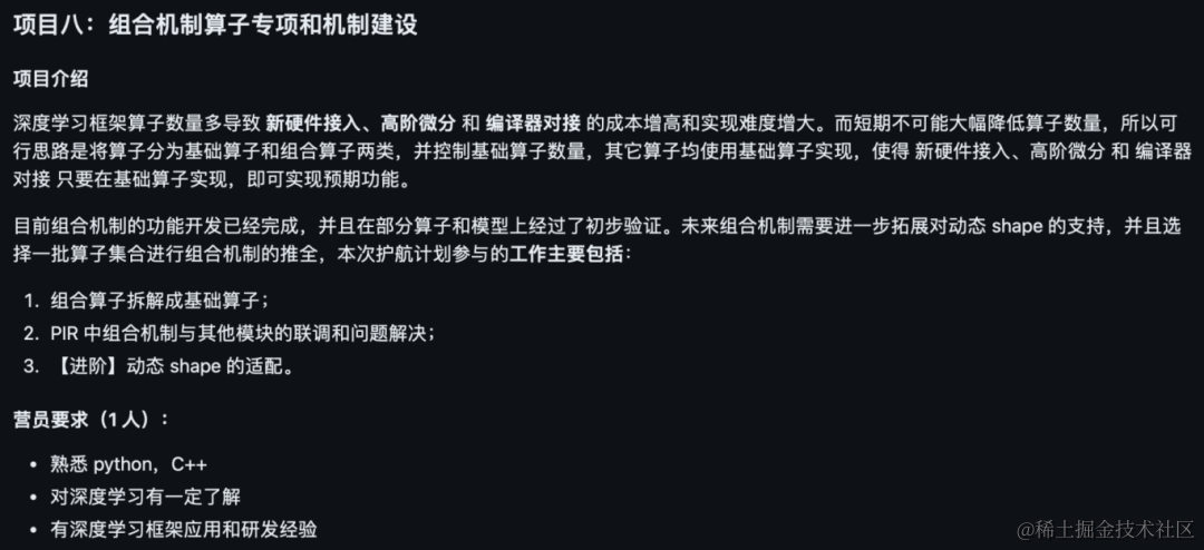 飞桨核心开源项目开发实践营,选手提交简历&通过面试后,以远程的方式深度参与飞桨重要开源项目开发实践,成果以PR(Pull Requests)的形式贡献到指定代码仓库,实训期3个月(每周开发时间至少25h),奖金6000-10000元。