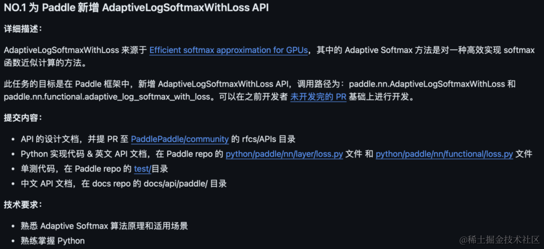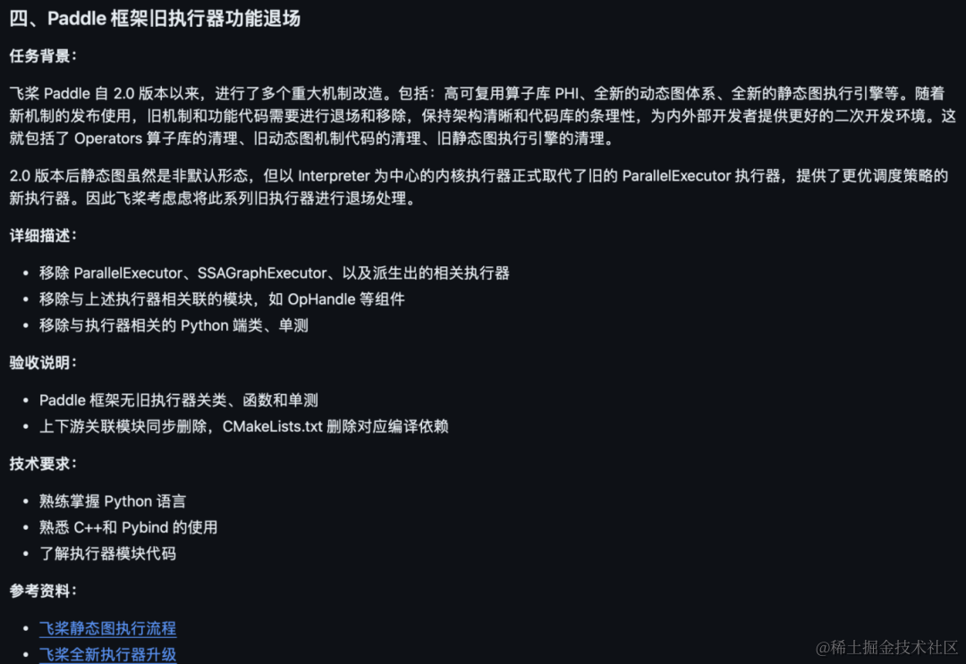 以开源贡献为核心,基于GitHub的飞桨及生态伙伴开源项目代码贡献。开源项目包括:飞桨核心框架、飞桨科学计算、生态伙伴项目等。 开发者使用GitHub ID报名,独立完成具有明确验收目标的贡献任务,获得对应的任务奖励。奖金2000-6000元。本期完成的框架开发任务能够进入飞桨框架新版本发版流程,贡献者成果被全体飞桨框架用户共享。