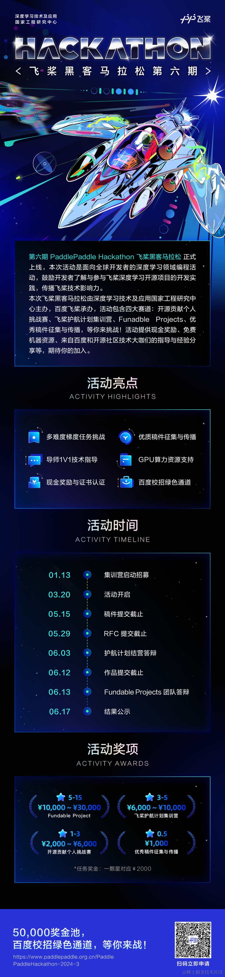 2024 PaddlePaddle Hackathon飞桨黑客马拉松第六期正式上线,本次活动是面向全球开发者的深度学习领域编程活动,鼓励开发者了解与参与飞桨深度学习开源项目的开发实践。本次飞桨黑客马拉松由深度学习技术及应用国家工程研究中心主办,飞桨承办,英特尔作为顶级赞助方共同出品,以线上认领任务的形式进行。你可以个人或组队报名并认领相应任务,根据任务要求完成相应开发,参与项目共建。本次共有四大赛道:开源贡献个人挑战赛、飞桨护航计划集训营、Fundable Projects、优秀稿件征集与传播,任你选择。对深度学习及大模型感兴趣的你,快来参加活动吧!更有机会获得现金奖励以及来自百度和开源社区技术大咖们的指导与经验分享,更多奖励等你来拿。