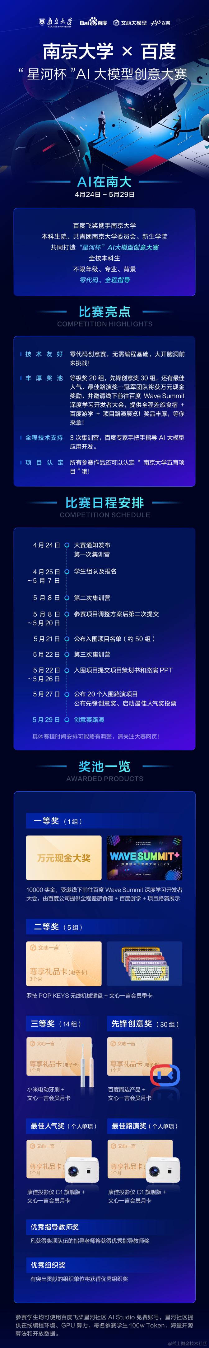 4月24日,百度飞桨携手南京大学本科生院、校团委、新生学院,面向南京大学全校本科生,首创“星河杯”AI大模型创意大赛,着力培养具有前瞻性、能够引领未来发展的拔尖创新领军人才,让更多南大学子认识和应用最新的人工智能大模型技术。