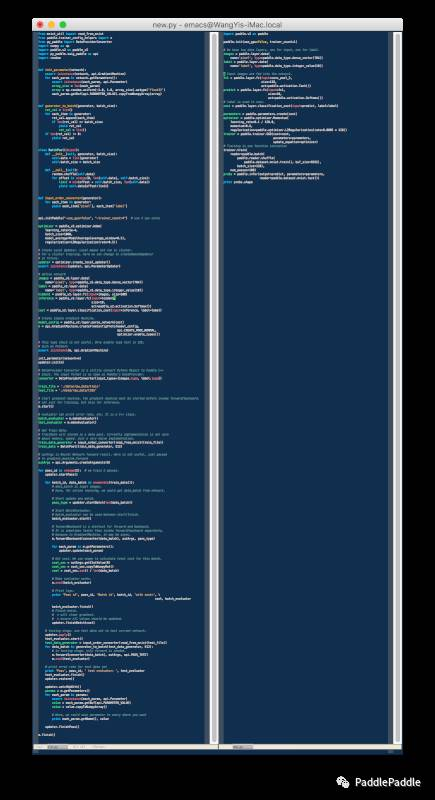 新版的API被称为V2 API,允许我们在单个.py文件中,通过编辑更短的Python程序来定义网络结构和数据。此外,该Python程序也可以在Jupyter Notebook中运行,因为PaddlePaddle可以作为共享库来被Python程序加载和使用。下图对比展示了一个卷积神经网络在旧API(图左半边)和新API(图右半边)的效果。
