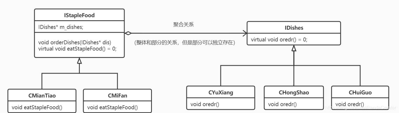 例子的uml,主食分为面条和米饭,而所提共的菜肴有鱼香茄子、红烧肉、回锅肉。