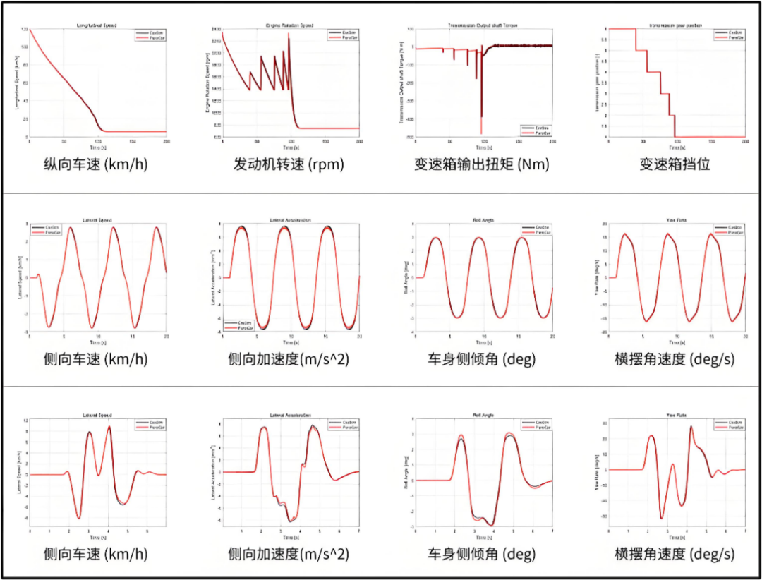 通过设定一系列测试场景来验证动力学模型模型精度。这些场景覆盖各种驾驶条件,如直线加速、转向、制动、过弯、不同路面条件(湿滑、干燥、雪地等)等, 收集每个场景下的车辆状态数据,包括但不限于速度、加速度、位置、方向、轮胎力等。最终结果表示PanoDrive内嵌的车辆动力学模型与CarSim仿真结果高度一致。