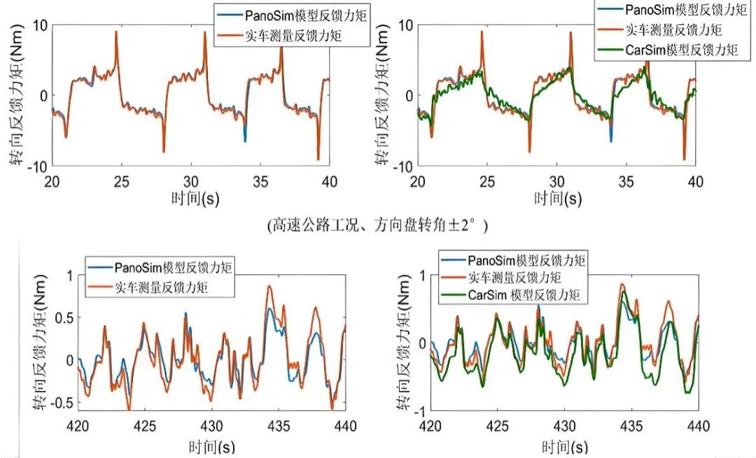 通过收集真实车辆在各种驾驶条件下的转向力感数据与PanoDrive内嵌的车辆动力学模型做对比,通过图表可视化对比转向力随时间的变化曲线,据对比分析的结果,PanoDrive的转向力感模拟精度超过95%。