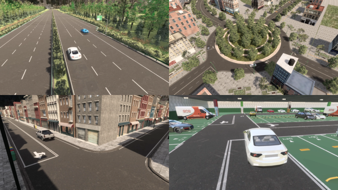 在PanoDrive中,提供了一系列方便选择的驾驶场景,以满足用户在不同环境下的测试和仿真需求。以下是一些常见的测试场景,如高速公路、环岛、乡镇、停车场等。用户可以选择预定义的场景,也可以创建自定义场景。