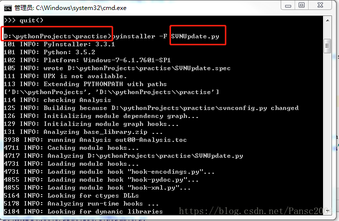 3. 命令行进入要需要生成exe的目标py文件目录;比如要将SVNUpdate.py生成exe,运行命令