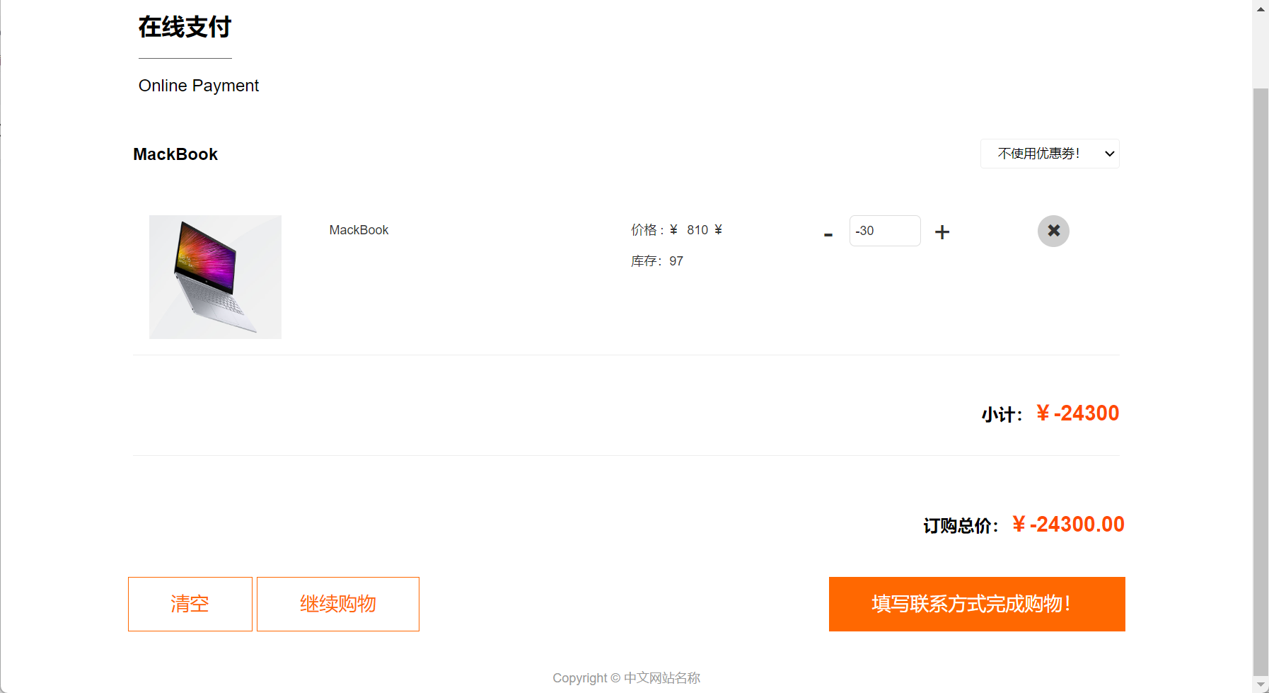 尝试修改数量为负数,提交,选择站内扣款