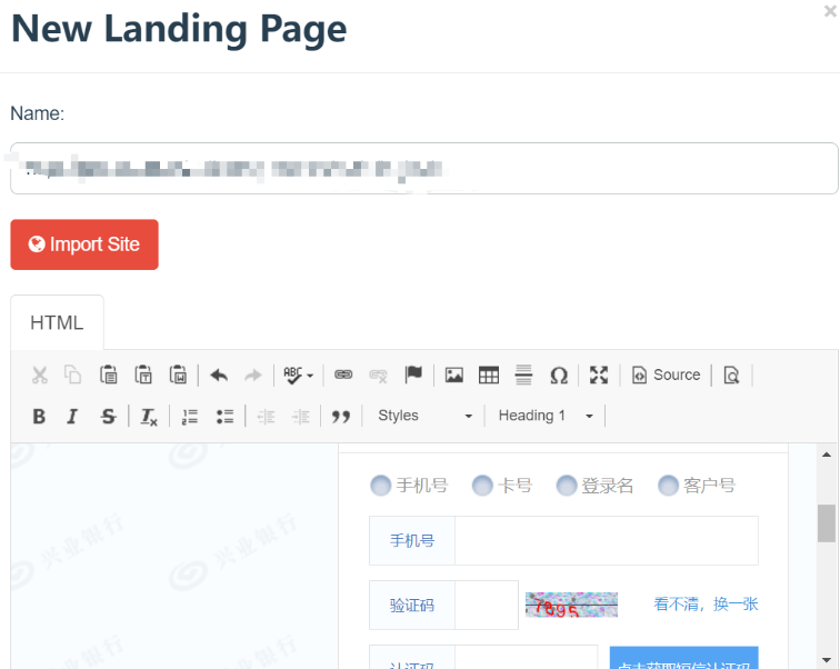 gophish支持手动编辑生成钓鱼邮件,Import Site填写被伪造网站的URL即可通过互联网自动抓取被伪造网站的前端代码。也支持导入现有邮件内容,配置时勾选捕获提交的数据和捕获密码,服务器会把相关数据保存下来