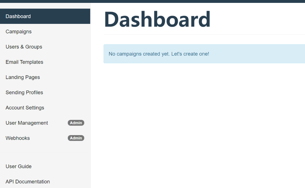 进入后台后,左边的栏目即代表各个功能,分别是Dashboard仪表板 、Campaigns钓鱼事件 、Users & Groups用户和组 、Email Templates邮件模板 、Landing Pages钓鱼页面 、Sending Profiles发件策略六大功能