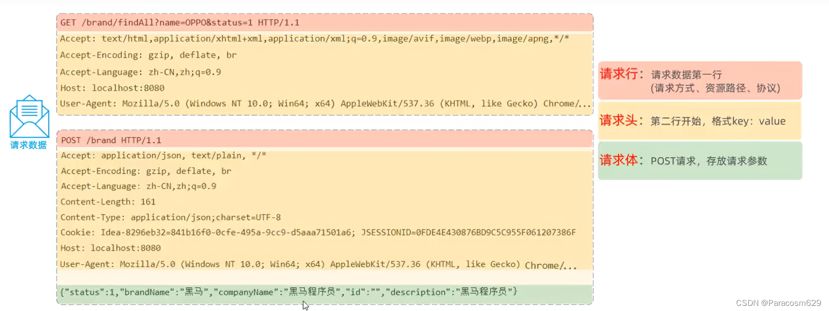 GET:请求参数在请求行中,没有请求体,参数会在路径后面加?如果还有就加&,如GET /brand/findAll?name = OPPO&status = 1 HTTP/1.1,且GET请求大小有限制