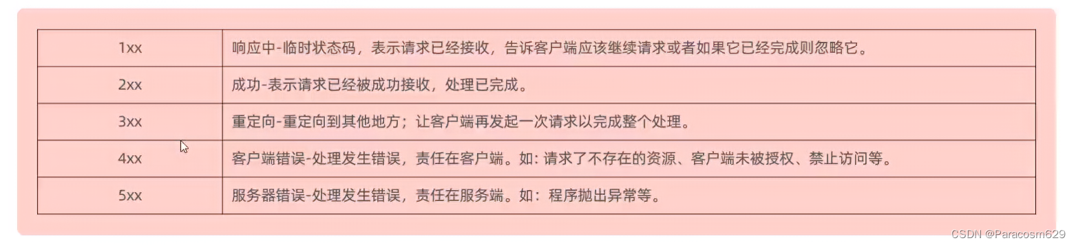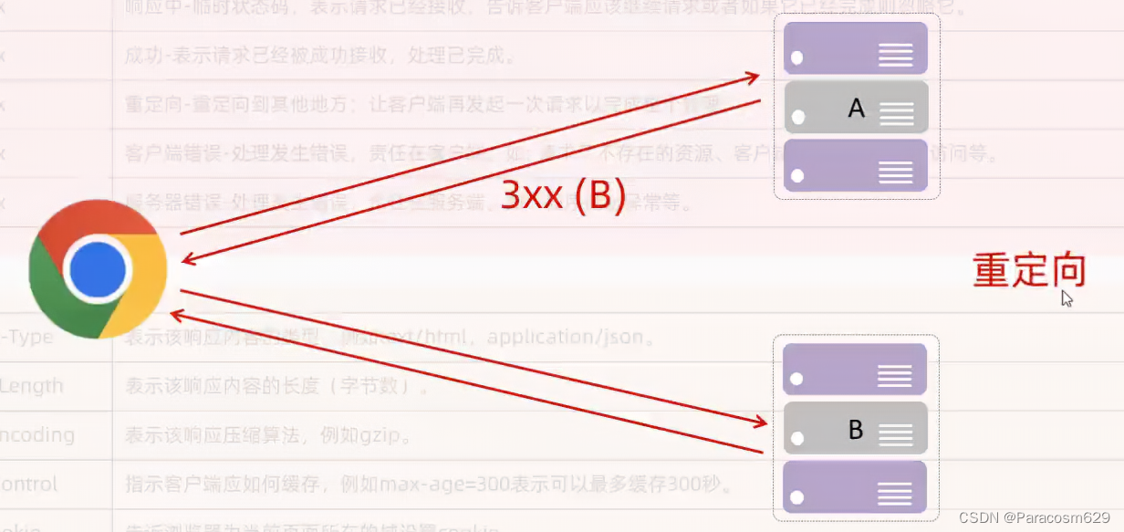 着重说明一下重定向,如下图,浏览器向服务器A进行请求,A服务器给浏览器返回一个状态 码,由于服务器A中不包含浏览器请求的资源,就让浏览器通过返回来的数据去访问B服务器, 从而使浏览器成功请求,服务器成功响应。